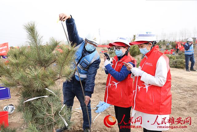 圖為志愿者測(cè)量苗木高度。中鐵雄安建設(shè)志愿服務(wù)隊(duì)供圖