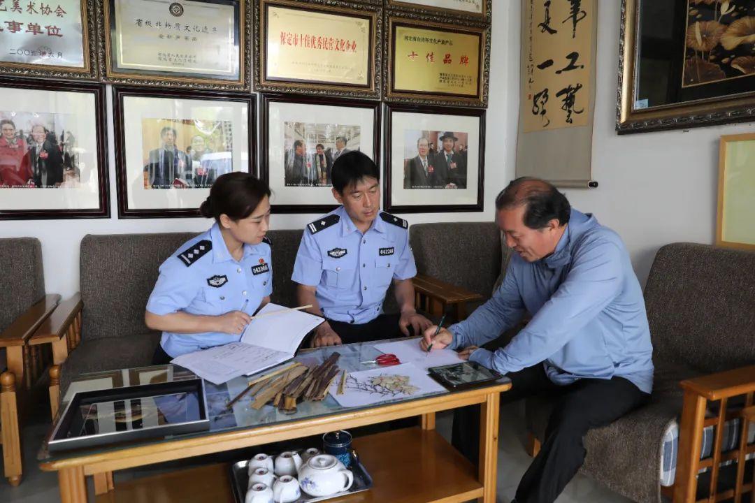 容城縣公安局交通管理大隊(duì)民警與蘆葦畫非遺傳承人楊丙軍老師深入交流交通安全文化創(chuàng)作思路和理念。