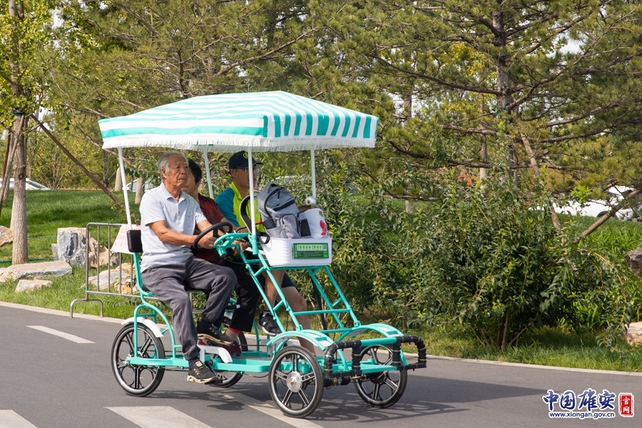 游客乘坐觀光自行車(chē)在園內(nèi)游玩。中國(guó)雄安官網(wǎng)毛鶴然 攝
