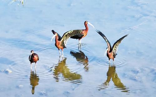 彩鹮是有著“東方寶石”之稱的朱鹮的近親,因?yàn)樗挠鹈谔栂聲W爍多彩金屬光澤,所以叫彩鹮?!吨袊鵀l危動物紅皮書》曾一度宣布彩鹮在我國絕跡。彩鹮在河北省雖有分布,但一次拍攝到6只“扎堆”出現(xiàn),卻也十分罕見。