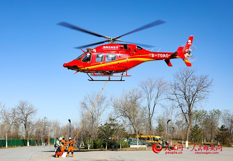 直升機(jī)準(zhǔn)備懸吊作業(yè)人員。人民網(wǎng)記者 宋燁文攝