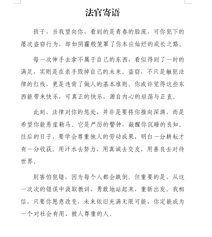 本案在向被告人送達起訴書的同時送達未成年人權(quán)益提示書,并為之指定法律援助律師,著重提示被告人所享權(quán)利,保障其訴求順暢表達。在開庭審理過程中嚴格落實不公開審理的庭審規(guī)范,尊重未成年人審判的內(nèi)在規(guī)律,在法庭辯論終結(jié)后,結(jié)合被告人成長和身心特點,由審判長對被告人開展入情入理的法庭教育,“以后要走正道,你還小,人生的機會還很多”,以未成年人聽得懂、能接受的語言,把法律、道理講清楚。