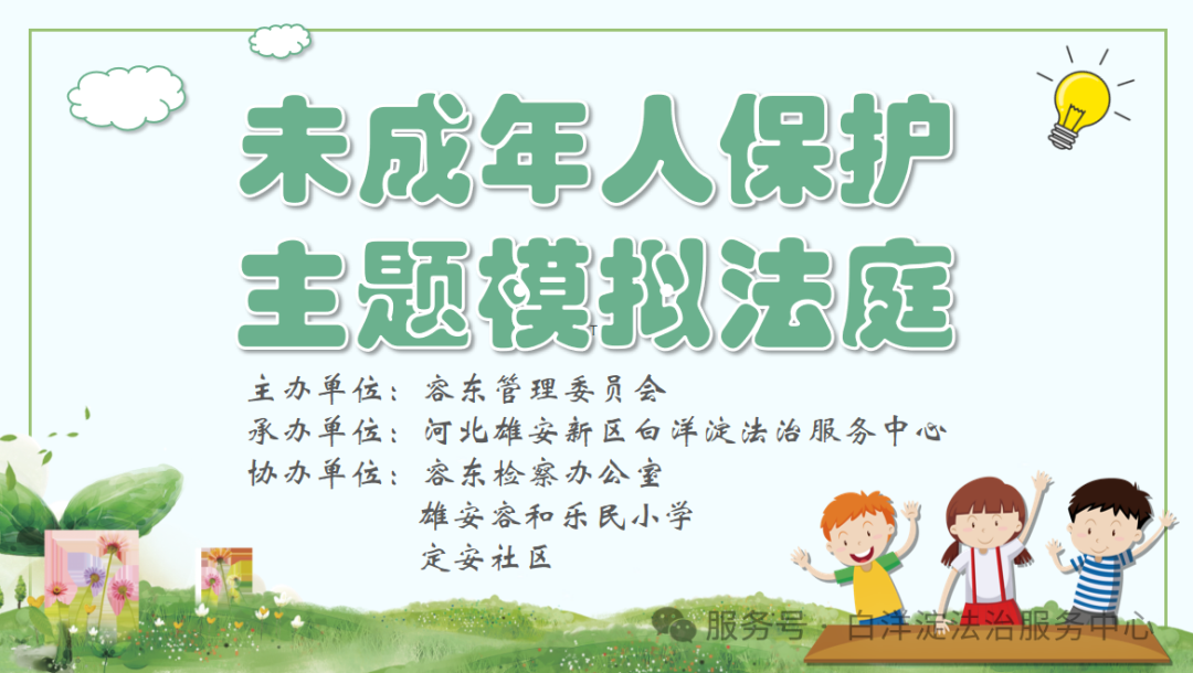 受容東片區(qū)管理委員會委托,河北雄安新區(qū)白洋淀法治服務(wù)中心在容東檢察辦公室、雄安容和樂民小學(xué)、定安社區(qū)的配合下,組織在校學(xué)生開展了以未成年人保護(hù)為主題的模擬法庭活動,為同學(xué)們帶來了一堂別開生面的法治教育課。