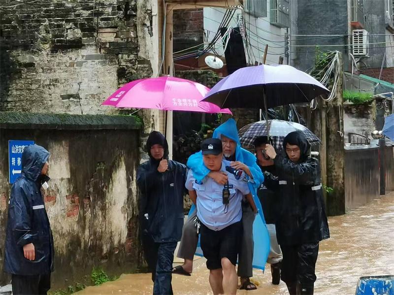 6月16日下午,懷集縣公安局鳳崗派出所與鎮(zhèn)政府工作人員在鳳崗舊圩冒雨轉(zhuǎn)移受災(zāi)群眾。李明烘 攝