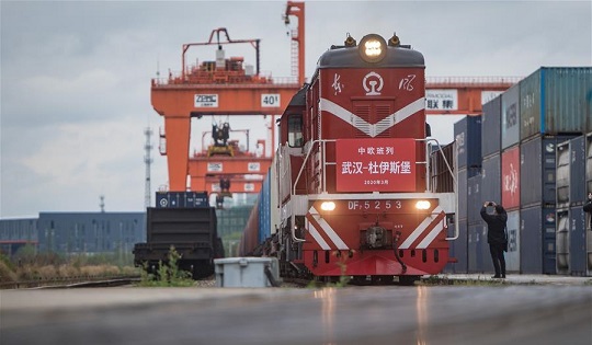3月28日,開往德國杜伊斯堡的中歐(武漢)班列從中鐵聯(lián)集武漢中心站駛出。 3月28日上午10點,中歐班列(武漢)X8015/6次運載50只集裝箱從中鐵聯(lián)集武漢中心站始發(fā)。班列將從阿拉山口出境,預(yù)計15天后抵達德國杜伊斯堡。這是自疫情防控以來,從武漢開出的首趟中歐班列,標志著中歐班列(武漢)恢復(fù)常態(tài)化運營。 新華社記者肖藝九攝