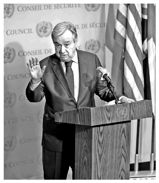 圖① 當(dāng)?shù)貢r(shí)間3月10日,聯(lián)合國秘書長古特雷斯在聯(lián)合國總部舉行的敘利亞危機(jī)爆發(fā)10周年記者會(huì)上發(fā)表講話。 CFP供圖