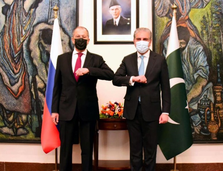 4月7日,巴基斯坦外長庫雷希(右)在伊斯蘭堡與到訪的俄羅斯外長拉夫羅夫碰肘留影。