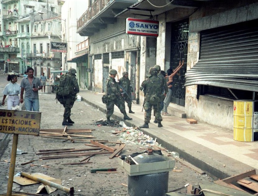 1989年,美國(guó)因巴拿馬運(yùn)河管轄等問(wèn)題武裝干涉巴拿馬。這張資料照片顯示,占領(lǐng)巴拿馬的美軍士兵在巴拿馬城街頭搜查行人。