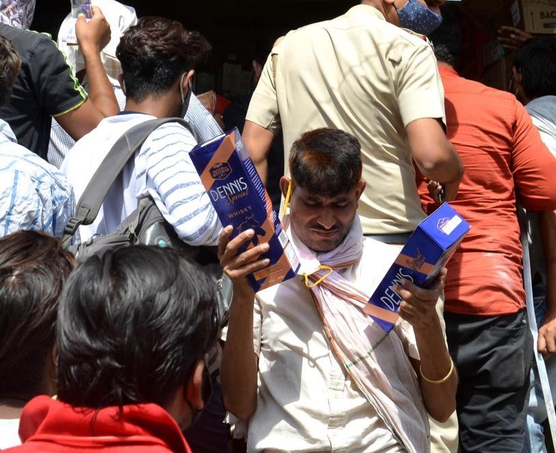 4月19日,印度新德里居民在全城實施封鎖前搶購酒品。