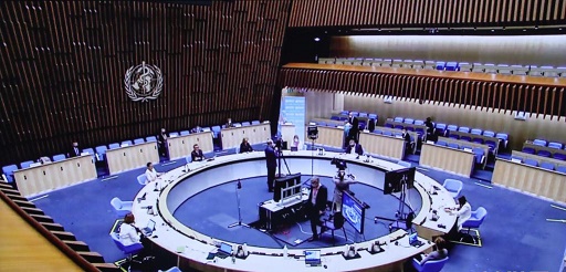 第74屆世界衛(wèi)生大會24日開幕。這是位于瑞士日內(nèi)瓦的世界衛(wèi)生組織總部會議現(xiàn)場(翻拍視頻畫面)。新華社記者 鄭煥松 攝