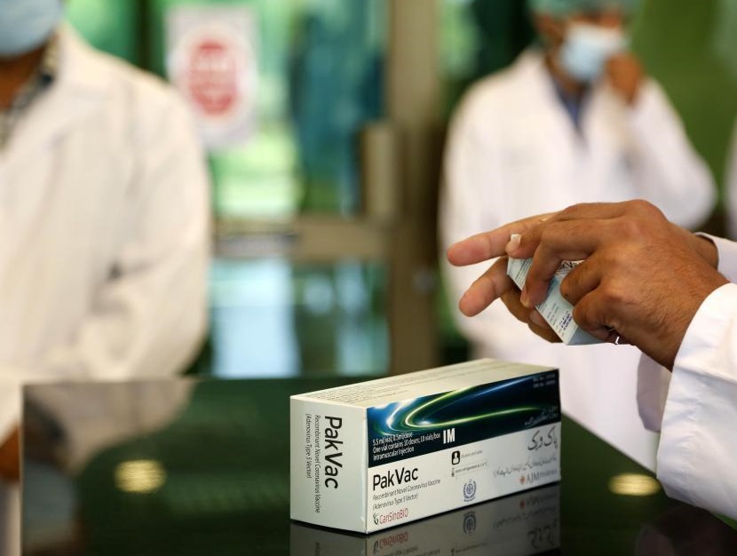 6月1日,在巴基斯坦伊斯蘭堡,工作人員展示本地灌裝生產的中國康希諾新冠疫苗。