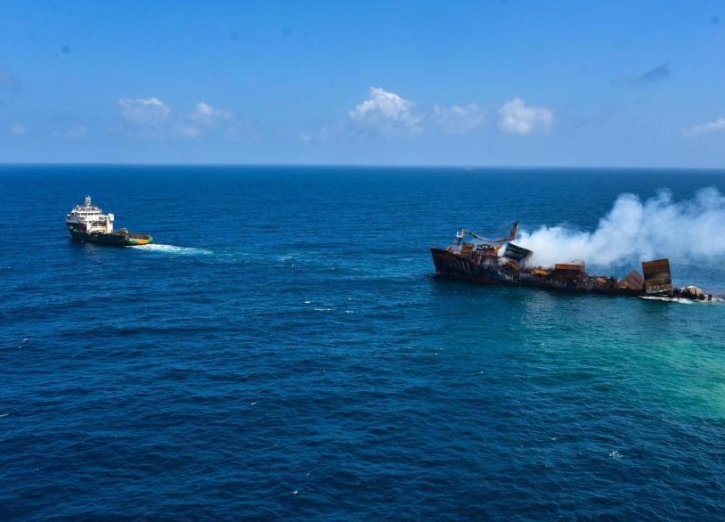 6月2日,斯里蘭卡總統(tǒng)戈塔巴雅下令將起火貨船“X-PRESS PEARL”號拖向遠離科倫坡港的深海區(qū),以防引發(fā)更大的環(huán)境災難?!癤-PRESS PEARL”號貨船5月20日抵達科倫坡港西北約9.5海里錨地時發(fā)出火警求救信號。斯里蘭卡海洋環(huán)境保護局官員5月28日表示,在科倫坡港附近起火燃燒的“X-PRESS PEARL”號貨船預計將會引發(fā)嚴重環(huán)境災難。新華社發(fā)(斯里蘭卡空軍媒體處供圖)