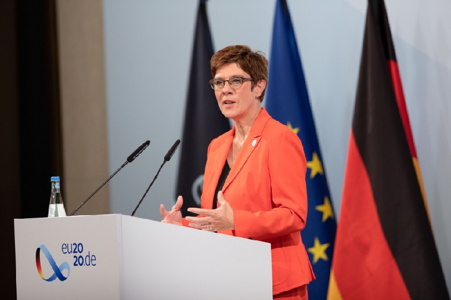 2020年8月26日,在德國首都柏林,德國國防部長克蘭普-卡倫鮑爾出席歐盟國防部長非正式會議后的新聞發(fā)布會。(新華社發(fā),德國聯(lián)邦國防軍供圖)