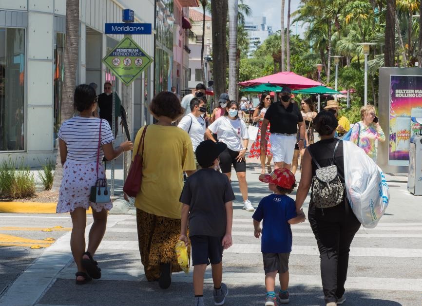 8月6日,人們在美國佛羅里達州邁阿密-戴德縣的一個商業(yè)區(qū)游覽。