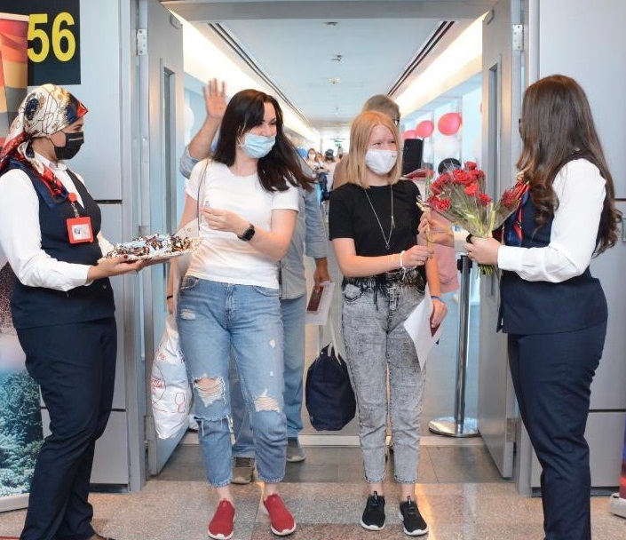 8月9日,機場工作人員在埃及紅海城市胡爾加達一機場歡迎抵達的俄羅斯旅客。