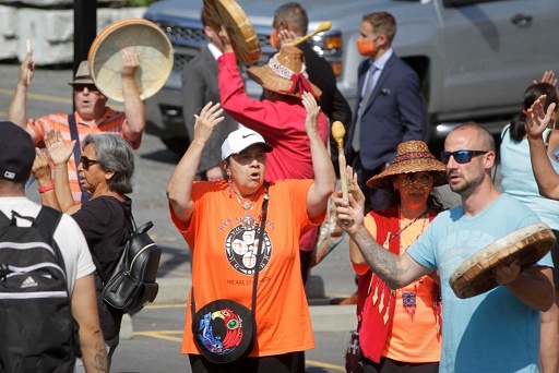 8月10日,在加拿大北溫哥華“圣保羅印第安寄宿學?!迸f址,人們在新聞發(fā)布會后擊鼓、唱歌。加拿大不列顛哥倫比亞省的三個原住民部族10日宣布,將對位于北溫哥華的“圣保羅印第安寄宿學?!迸f址展開調查。(新華社發(fā),梁森攝)