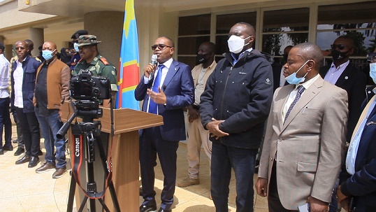 11月3日,剛果(金)南基伍省省長卡西(中)在該省首府布卡武市就當天凌晨發(fā)生的襲擊召開新聞發(fā)布會。