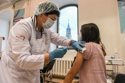 11月4日,在俄羅斯首都莫斯科的古姆百貨商場(chǎng),一名女子接種新冠疫苗。