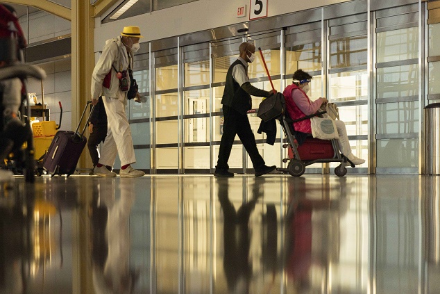12月4日,在美國弗吉尼亞州阿靈頓的羅納德·里根華盛頓國家機(jī)場,戴口罩的旅客走在航站樓內(nèi)。