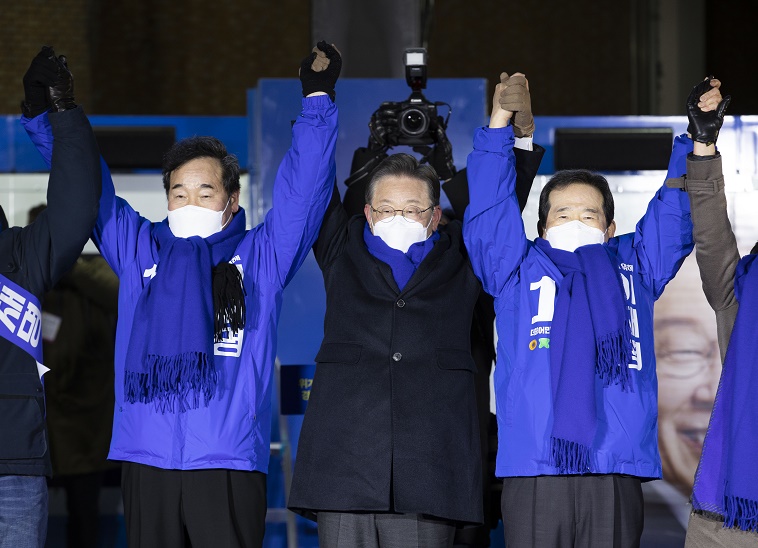 2月15日,候選人李在明(中)在韓國(guó)首爾參加競(jìng)選活動(dòng)。