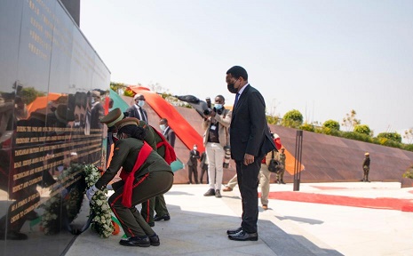 8月10日,在贊比亞盧薩卡省瓊圭地區(qū)的坦贊鐵路紀(jì)念園,贊比亞總統(tǒng)希奇萊馬(前右)向?yàn)樾藿ㄌ官濊F路等項目而犧牲的中方人員敬獻(xiàn)花圈。新華社發(fā)(中國土木工程集團(tuán)供圖)