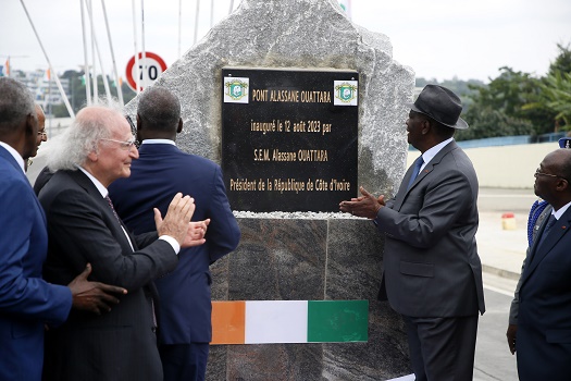 12日,在科特迪瓦經(jīng)濟(jì)首都阿比讓?zhuān)铺氐贤呖偨y(tǒng)瓦塔拉(右二)為科科迪橋揭幕。新華社發(fā)(伊萬(wàn)·宋攝)