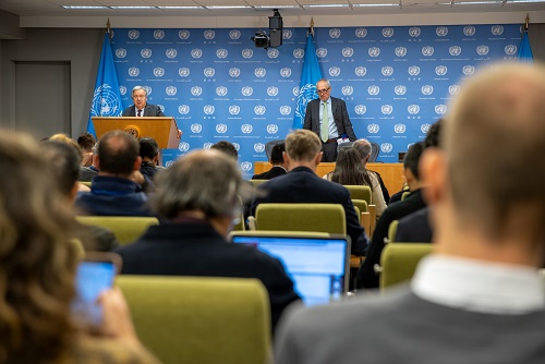 9日,在位于紐約的聯合國總部,古特雷斯在記者會上就巴以局勢發(fā)表談話。新華社發(fā)(聯合國供圖/保羅·菲爾蓋拉斯攝)