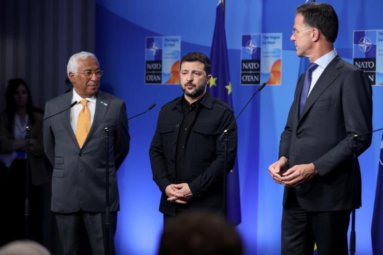 6月24日,在荷蘭海牙,烏克蘭總統(tǒng)澤連斯基(中)在北約峰會期間對記者講話。新華社記者趙丁喆攝