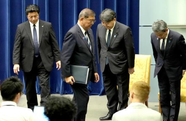 圖為當(dāng)?shù)貢r(shí)間2025年9月7日,日本首相石破茂(左二)在首相官邸舉行新聞發(fā)布會后離開。 CFP供圖
