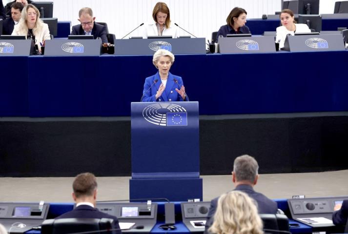 圖為當(dāng)?shù)貢r間10月8日,法國斯特拉斯堡,歐盟委員會主席馮德萊恩在歐洲議會發(fā)言時談及構(gòu)筑“無人機墻”相關(guān)問題。 CFP供圖