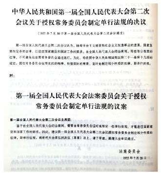 1955年7月30日,根據(jù)法案委員會的建議,一屆全國人大二次會議作出決定:“隨著社會主義建設和社會主義改造事業(yè)的進展,國家急需制定各項法律,以適應國家建設和國家工作的要求。在全國人民代表大會閉會期間,有些部分性質的法律,不可避免地急需常務委員會通過施行。為此,特依照中華人民共和國憲法第三十一條第十九項的規(guī)定,授權常務委員會依照憲法的精神、根據(jù)實際的需要,適時地制定部分性質的法律,即單行法規(guī)?!痹摏Q定改變了全國人大是行使國家立法權唯一機關的規(guī)定,是對1954年憲法的重要補充和發(fā)展。