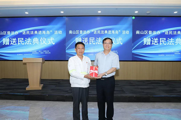 9月1日下午,廣東省深圳市司法局黨委副書記、副局長蔣小文,普法和依法治理處處長劉偉東,蛇口街道黨工委書記藍濤,南山區(qū)司法局局長康甲光一起,將一批民法典送到了位于前海蛇口水域的孖洲島。