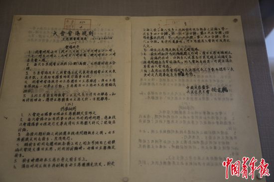 展廳第二部分“中共六大的籌備與召開”中展出的大會(huì)會(huì)場(chǎng)規(guī)則文件。中青報(bào)·中青網(wǎng)駐俄羅斯記者 張?。瘮z
