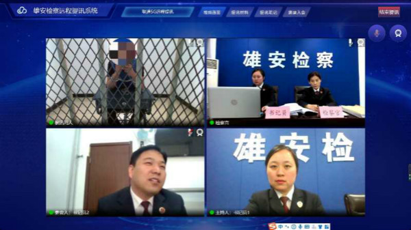 在整個(gè)庭審過程中,審判員、檢察官及上訴人身處三地,其中,審判員在雄安新區(qū)中級(jí)人民法院法庭,檢察官在檢察院視頻室,上訴人在看守所視頻室,一起通過5G遠(yuǎn)程網(wǎng)絡(luò)視頻共同參與庭審。