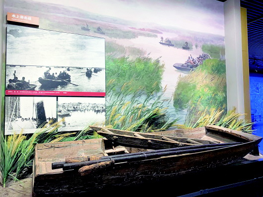 跟隨任京培的步伐,記者看到了紀念館中陳列的一艘長約三四米的木船,上面被日軍射擊的累累彈痕印證著歷史。在船上,還有兩把近3米的大抬杠槍。任京培說,這是一種當?shù)孬C人發(fā)明的武器,槍筒又長又粗,不但打得遠,而且火力足威力大。