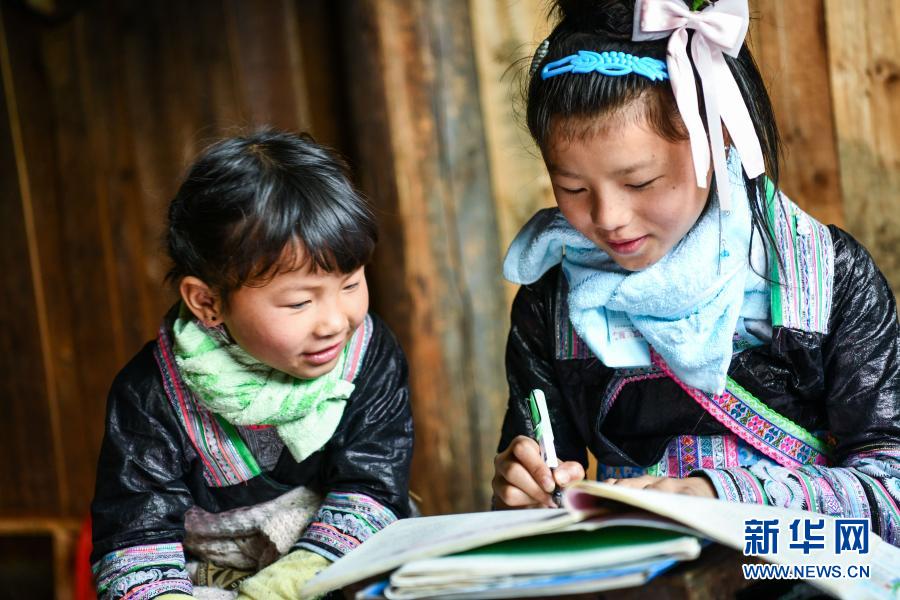 2月25日,貴州省從江縣丙妹鎮(zhèn)大歹小學(xué)的學(xué)生潘污簡(右)與堂妹在家里做寒假作業(yè)。新華社記者 楊文斌 攝