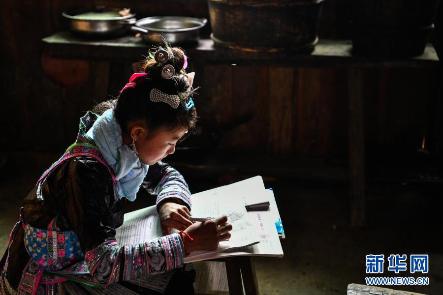 2月25日,貴州省從江縣丙妹鎮(zhèn)大歹小學(xué)的學(xué)生潘污簡在家里做寒假作業(yè)。新華社記者 楊文斌 攝