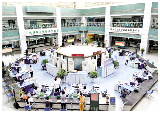 2013年,國務(wù)院決定先行取消和下放91項(xiàng)行政審批事項(xiàng),并要求各部門加大減少和下放行政審批事項(xiàng)工作力度,簡政放權(quán)、放管結(jié)合、優(yōu)化服務(wù),簡稱“放管服”改革。圖為四川省人民政府政務(wù)服務(wù)大廳。 法治日報(bào)全媒體記者 楊晉峰 攝