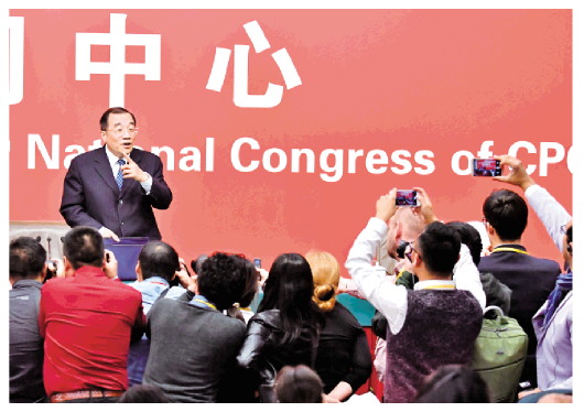 2017年10月19日,中國共產(chǎn)黨第十九次全國代表大會(huì)舉行記者招待會(huì),請時(shí)任中央紀(jì)委副書記、監(jiān)察部部長、國家預(yù)防腐敗局局長楊曉渡等介紹加強(qiáng)黨建工作和全面從嚴(yán)治黨,堅(jiān)定不移推進(jìn)依規(guī)治黨,建設(shè)完善黨內(nèi)法規(guī)體系的情況。李鑫 攝