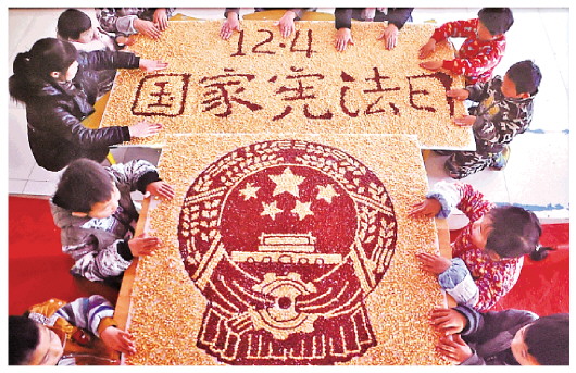 為了增強(qiáng)全社會(huì)的憲法意識(shí),弘揚(yáng)憲法精神,加強(qiáng)憲法實(shí)施,全面推進(jìn)依法治國,2014年11月,全國人大常委會(huì)作出決定將12月4日設(shè)立為國家憲法日。圖為2014年12月,山東省沂源縣小朋友用玉米、紅小豆等作物制作出各種法治宣傳畫,迎接首個(gè)“國家憲法日”。 (資料圖片)