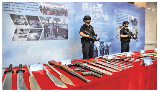 2018年1月,中共中央、國務(wù)院發(fā)布《關(guān)于開展掃黑除惡專項(xiàng)斗爭的通知》。三年來,全國共打掉涉黑組織3644個(gè),黑惡犯罪得到根本遏制。圖為廣東警方查扣的涉黑涉惡團(tuán)伙的涉案物品。 鄧華 攝