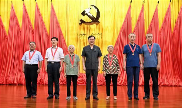 會(huì)場(chǎng)內(nèi),紅旗漫卷,紅色紀(jì)念章閃耀奪目的光芒。頒授儀式在莊嚴(yán)的國歌聲中正式開始。當(dāng)榮獲“光榮在黨50年”紀(jì)念章的老黨員代表們步入會(huì)場(chǎng)時(shí),會(huì)場(chǎng)響起熱烈的掌聲。
