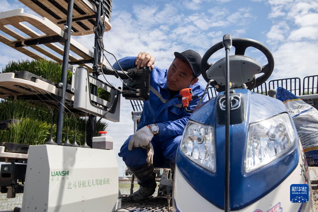在北大荒集團紅衛(wèi)農(nóng)場有限公司智慧農(nóng)業(yè)先行示范區(qū)內(nèi),工作人員設置無人駕駛插秧機工作路徑(5月11日攝)。據(jù)介紹,無人駕駛智能插秧機應用北斗衛(wèi)星定位系統(tǒng),田間作業(yè)時可實現(xiàn)自動避障、掉頭和轉彎。新華社記者 張濤 攝