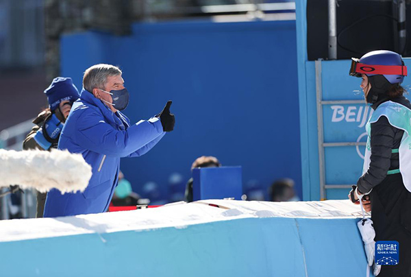 2月8日,國際奧委會(huì)主席巴赫(左)向中國選手谷愛凌表達(dá)祝賀。