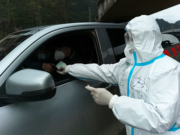 看到一輛面包車從遠(yuǎn)處駛來(lái),楊京龍舉起手中的停車牌,示意司機(jī)停車接受檢查?!巴?,你的通行證已過(guò)期,不能從這里通過(guò)?!笨吹剿緳C(jī)的通行證已過(guò)期,楊京龍耐心講解了疫情防控期間的交通管制政策,勸返司機(jī)。