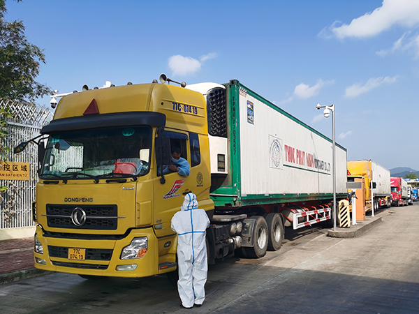 廣西東興出入境邊防檢查站為全力保障口岸貨車及司機高效、安全、優(yōu)質(zhì)通關(guān),按照閉環(huán)管理要求,全面推行7×24小時貨物通關(guān)服務(wù),隨到隨檢,全年不休,全力以赴保障疫情防控常態(tài)化條件下中越跨境貿(mào)易順暢通關(guān)。圖為民警對跨境貨車進行檢查。林珉正 攝