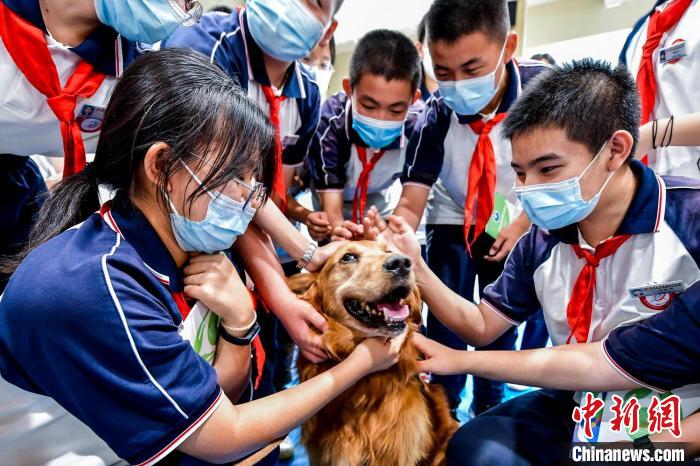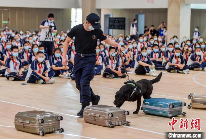 學(xué)生們與展示完搜索毒品技能的緝毒犬親密互動。 劉新 攝